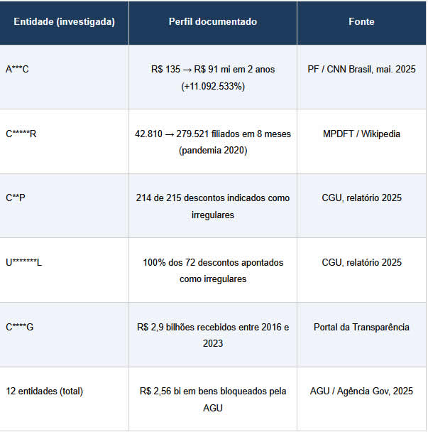 Fonte: CGU, PF (Operação Sem Desconto), Portal da Transparência. Nomes de entidades constam em documentos públicos oficiais.