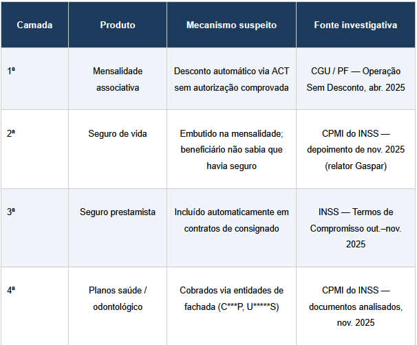 Se a investigação centrou-se inicialmente nas mensalidades associativas, os trabalhos da CPMI e os processos administrativos do INSS revelaram que o mecanismo de extração operava em pelo menos quatro camadas de produto, frequentemente superpostas. A distinção entre elas é juridicamente relevante, pois cada uma implica responsabilidades distintas e diferentes marcos regulatórios.