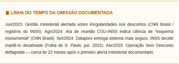 A resposta começa a emergir dos documentos públicos. Uma ata de reunião da CGU com a direção do INSS, datada de 9 de agosto de 2024 — portanto oito meses antes da Operação Sem Desconto —, teria mostrado que "já se sabia que um esquema monumental estava para ser estourado e a direção da autarquia se omitiu", segundo reportagem da CNN Brasil.³⁴ Em junho de 2023, a gestão do Ministério da Previdência havia sido alertada sobre indícios de irregularidades nos descontos, segundo relato documentado pela CNN Brasil com base nos registros da autarquia.³⁵ Em reunião do Conselho Nacional de Previdência Social (CNPS), uma conselheira representante dos aposentados solicitou formalmente que a pauta incluísse discussão sobre os ACTs das entidades investigadas — requerimento que foi negado, conforme ata citada pela CNN Brasil.³⁶