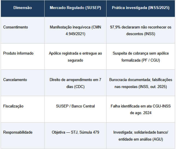 O mercado securitário formal e regulado opera sob supervisão da SUSEP, produz contratos legítimos e cumpre função social relevante. O que diferencia o produto legítimo do mecanismo investigado é exclusivamente o consentimento: no mercado formal, seguro de vida ou prestamista é contratado com ciência e concordância expressa do beneficiário. O que os processos administrativos do INSS identificaram foi sua inclusão automática — como produto avulso ou como conteúdo de mensalidade associativa — sem essa condição. O setor regulado tem interesse objetivo na investigação rigorosa: a confusão entre a cobrança irregular e o produto legítimo tem potencial para deprimir a confiança dos consumidores em seguros de proteção financeira para idosos — exatamente o segmento que mais se beneficia desses produtos.