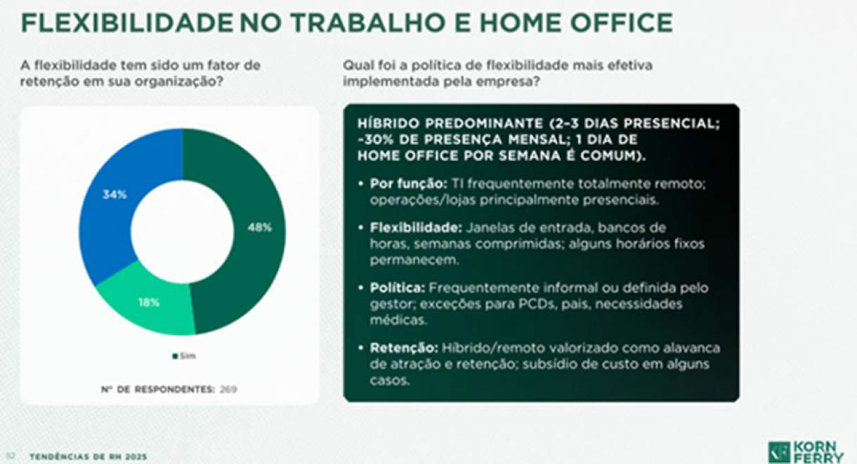 Quando questionadas se a flexibilidade tem sido um fator de retenção, 48% das empresas afirmam que sim. Entre as políticas consideradas mais eficazes, destaca-se o modelo híbrido predominante, com dois a três dias presenciais, cerca de 30% de presença mensal e, em muitos casos, um dia fixo de home office por semana.