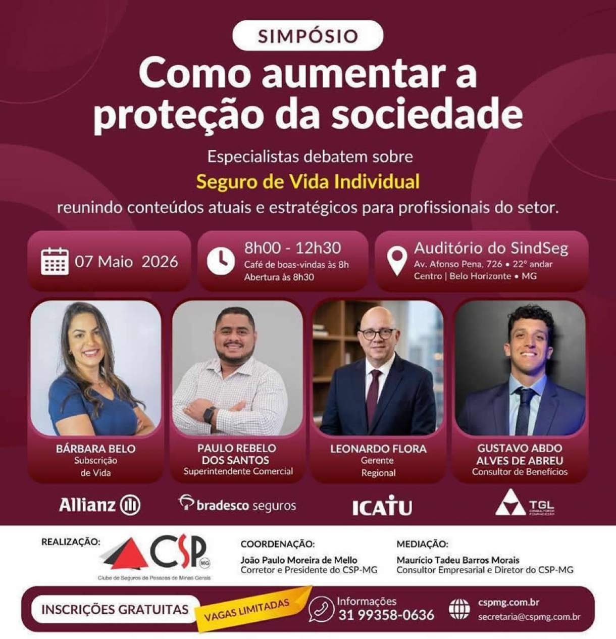 O simpósio reunirá especialistas para discutir temas estratégicos e atuais do segmento, promovendo a troca de experiências e a atualização dos profissionais do mercado. Participam desta edição a especialista Bárbara Belo, da área de Subscrição de Vida da Allianz; o superintendente comercial da Bradesco Seguros, Paulo Rebelo dos Santos; o gerente regional da Icatu Seguros, Leonardo Flora; e o consultor de benefícios da TGL Consultoria Financeira, Gustavo Abdo Alves de Abreu.