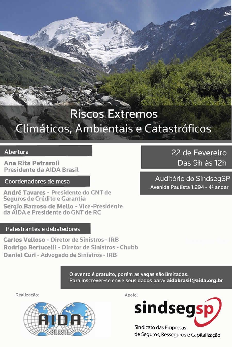 Estão abertas as inscrições para o evento da AIDA - Associação Internacional de Direto de Seguros, que debaterá o tema "Riscos Extremos: Climáticos, Ambientais e Catastróficos" no dia 22 de fevereiro, no auditório do SindsegSP, em São Paulo.