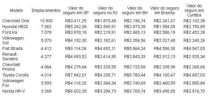 Diante desse levantamento, a Bidu Corretora realizou um levantamento que aponta o valor do seguro dos dez modelos mais emplacados no último mês. Para a cotação, foi utilizado o perfil de um homem, de 35 anos, casado, sem filhos, com garagem em casa e no trabalho e que está contratando seguro pela primeira vez. As cotações foram realizadas em cinco capitais brasileiras.