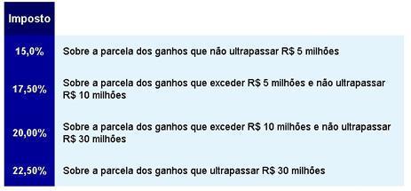 Desde 1º de janeiro de 2017 está valendo a Lei nº 13.259/2016, que alterou o artigo 21 da Lei nº 8.981/1995, e que prevê o aumento da tributação sobre o ganho de capital. A alíquota do Imposto de Renda sobre o ganho de capital está vinculada ao valor, e que até 2016 era fixa de 15%.