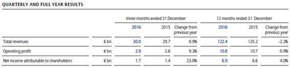 - Receita líquida atribuível aos acionistas em 2016 teve alta de 4% e atingiu €6,9 bilhões
