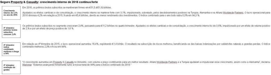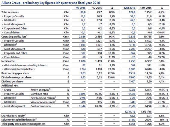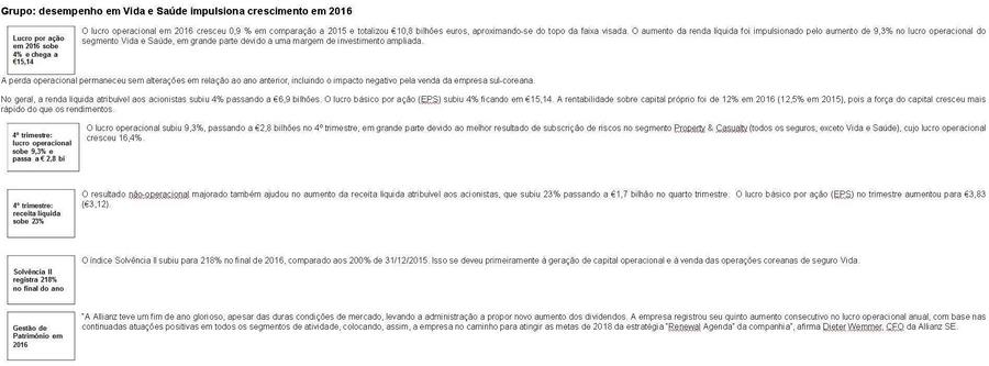 O Grupo Allianz entregou €10,8 bilhões em lucro operacional em 2016, próximo ao topo da faixa visada. Esse é o quinto aumento consecutivo nos resultados operacionais anuais. A receita líquida atribuível aos acionistas cresceu 4%, em comparação a 2015, levando a Allianz a aumentar ainda mais seus dividendos que passaram a €7,60. A Allianz também lançará um plano de recompra de ações (buy-back) de 12 meses no valor de até €3 bilhões, representando cerca de 4,2 % do seu capital acionário. Sendo a maior seguradora da Europa em termos de valor de mercado, a Allianz teve grandes avanços na implementação da sua estratégia “Renewal Agenda” em 2016, colocando a empresa no rumo certo para atingir suas metas para 2018.