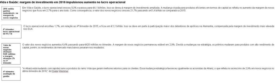 O segmento Vida e Saúde teve o maior crescimento no lucro operacional, com aumento de 9,3%, totalizando €4,1 bilhões. Os resultados crescentes dos investimentos foram o principal fator impulsionador. A margem de novos negócios aumentou para 2,7% em 2016 comparada aos 2,2 % em 2015, demonstrando a capacidade da Allianz em implementar mudanças estratégicas de forma rápida e rentável, em resposta ao ambiente com baixas taxas de juros.