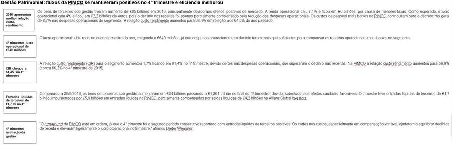 O segmento de Gestão Patrimonial assinalou um marco importante, uma vez que a PIMCO gerou dois trimestres consecutivos com entrada líquida de terceiros na segunda metade de 2016. Houve aumento de 6,1% no total do patrimônio sob gestão que passou para €1,871 trilhão no final do ano, principalmente, devido aos efeitos positivos de mercado.