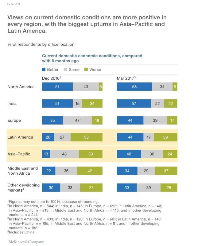Um estudo tradicional de medição de opiniões e expectativas empresariais é o realizado trimestralmente pela consultoria McKinsey. Recentemente, saiu com as respostas de março de 2017. Na média, em torno de duas mil entrevistas.