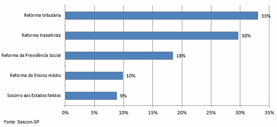 O governo tem anunciado uma série reformas estruturais necessárias e urgentes ao desenvolvimento brasileiro, mas qual delas deve ter prioridade? Uma enquete realizada pelo Sindicato das Empresas de Serviços Contábeis e de Assessoramento no Estado de São Paulo (Sescon-SP) com cerca de 400 empresários de contabilidade revelou que as reformas tributária (33%) e trabalhista (30%) devem ser aprovadas primeiro. As reformas da Previdência (18%), do ensino médio (10%) e medidas de socorro aos Estados falidos (9%) também foram citados.