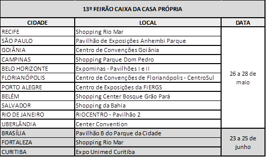 Maior evento imobiliário do país, o Feirão Caixa da Casa Própria começa este fim de semana – de 26 a 28 de maio – e, até o dia 25 de junho, terá passado por 14 cidades em todas as regiões.
