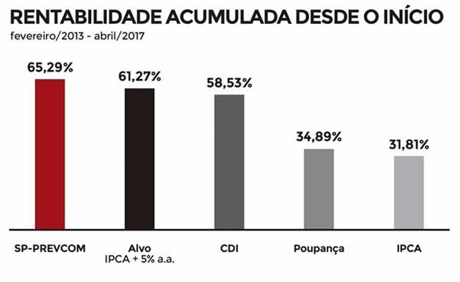 O fundo de previdência complementar registrou rentabilidade de 65,29% sobre o capital investido de janeiro de 2013 a abril de 2017. Este resultado supera os 61,27% da meta estabelecida para a SP-PREVCOM de IPCA+5%. Bate também os 58,53% do CDI e fica acima dos 34,89% da caderneta de poupança e da inflação do período, que fechou em 31,81%.