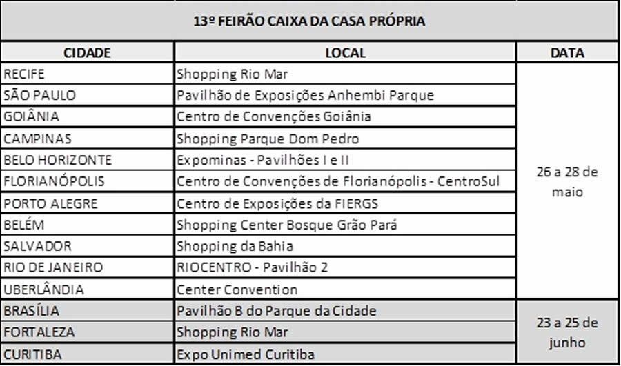 Maior evento imobiliário do país, o Feirão Caixa da Casa Própria começa este fim de semana – de 26 a 28 de maio – e, até o dia 25 de junho, terá passado por 14 cidades em todas as regiões.