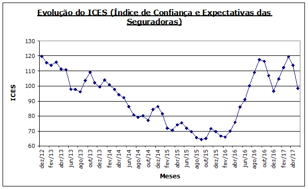 - Infelizmente, há dois meses, novas revelações políticas (com o conseqüente aumento da incerteza) estão preocupando de novo o país e, naturalmente, o setor de seguros. De um patamar de 120 pontos no ICES, voltamos ao nível de 100 pontos (vide a décima seta), e ainda com uma tendência de baixa. Hoje, o sucesso ou não das reformas ou mesmo a possibilidade de haver um novo governo já surgem no horizonte. Nesse momento, a torcida é que todos esses fatos não atrapalhem a recuperação de toda a economia.