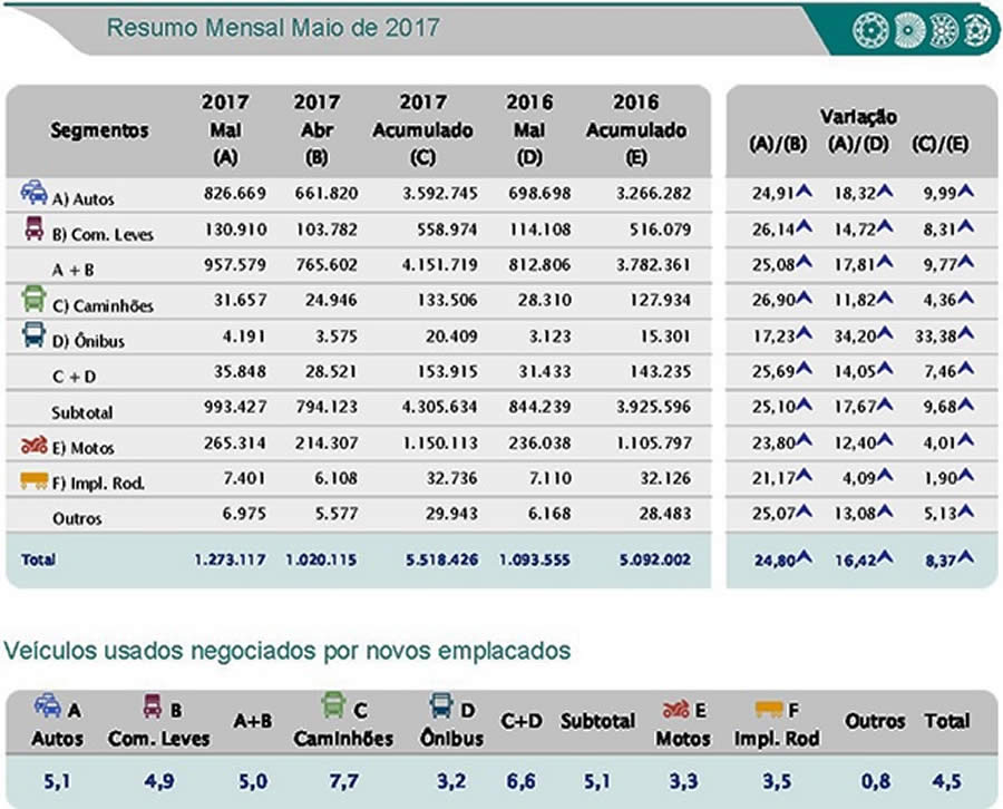 As transações de veículos usados, considerando todos os segmentos automotivos somados (automóveis, comerciais leves, caminhões, ônibus, motocicletas, implementos rodoviários e outros veículos), apresentaram alta de 24,8% em maio, na comparação com o mês anterior. Ao todo, foram transacionadas 1.273.117 unidades em maio de 2017, contra 1.020.115 em abril. Na comparação com o mês de maio/2016, o resultado geral de transações de usados apresentou crescimento de 16,42%, chegando a 1.093.555 unidades comercializadas no período.