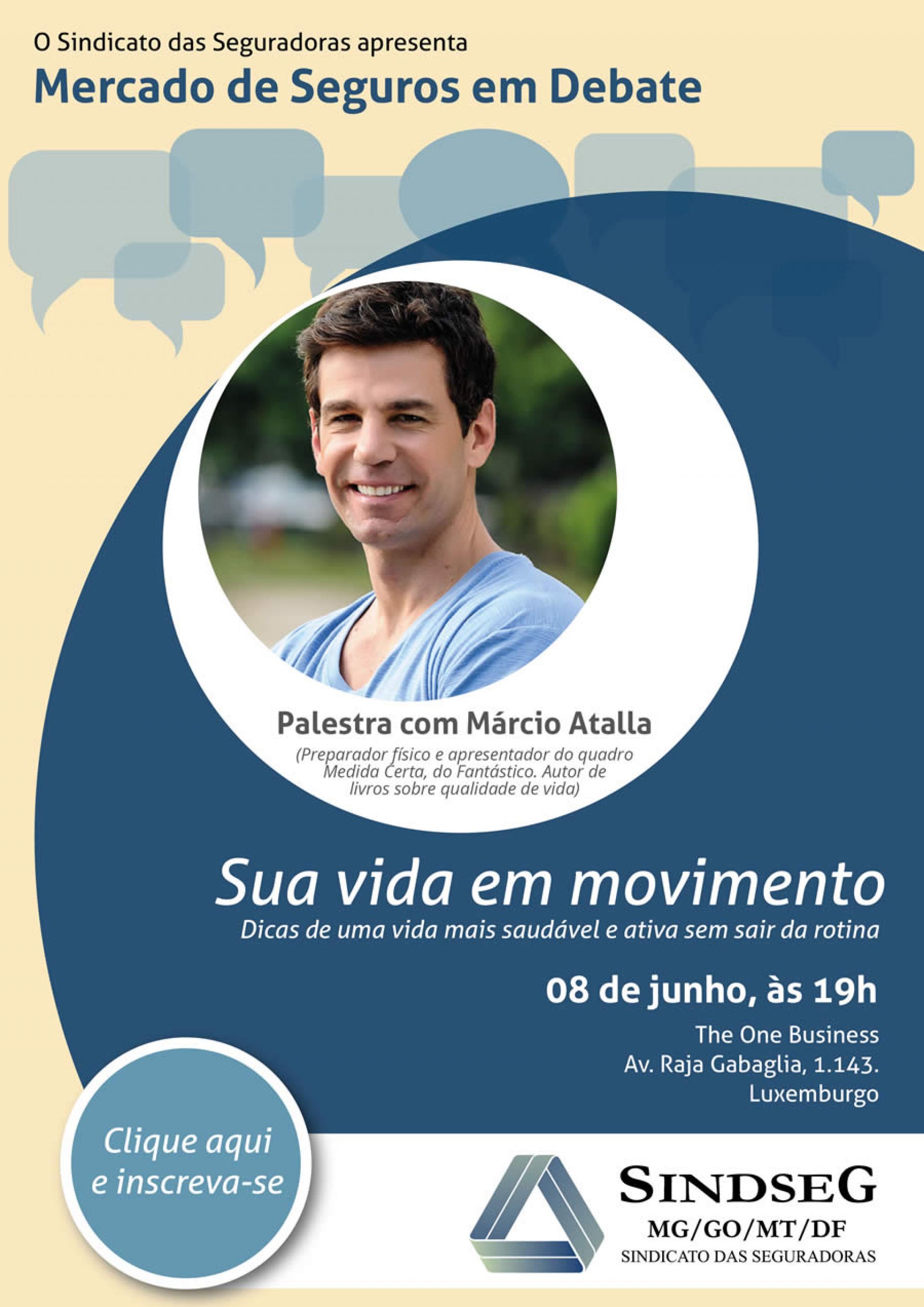 O Sindicato das Seguradoras de Minas Gerais, de Goiás, do Mato Grosso e do Distrito Federal (SindSeg MG/GO/MT/DF) promove hoje, dia 8 de junho, no espaço de eventos The One Business, às 18h30, a palestra “Sua vida em movimento”, com Márcio Atalla. O público presente vai receber dicas para uma vida mais saudável e ativa e poderá tirar dúvidas sobre atividade física e alimentação. Márcio Atalla é professor de Educação Física, com especialização em Treinamento de Alto Rendimento, e pós-graduação em Nutrição, pela USP. Preparador físico e apresentador do quadro Medida Certa, do Fantástico (TV Globo), Marcio é autor de vários livros sobre qualidade de vida.