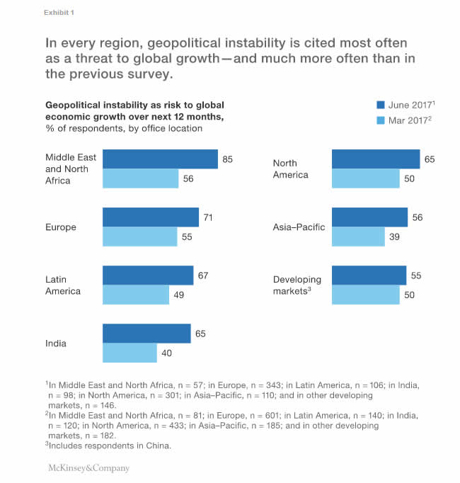 No seu tradicional levantamento trimestral de previsões econômicas, quando são entrevistados mais de mil grandes executivos em todo mundo, a consultoria McKinsey detectou um aumento nas expectativas de maiores riscos geopolíticos nos próximos 12 meses.