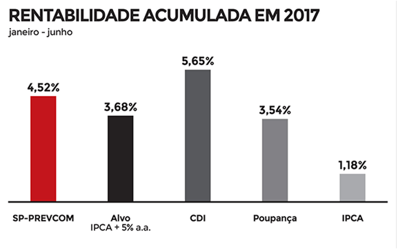 Apesar da instabilidade econômica no primeiro semestre de 2017, a Fundação de Previdência Complementar do Estado de São Paulo (SP-PREVCOM) superou seu objetivo de rentabilidade no período. Nos seis primeiros meses do ano, a Fundação obteve rendimento de 4,52% ultrapassando a meta (IPCA + 5%) que atingiu 3,68%. Este resultado ficou acima da caderneta de poupança, que apurou 3,54%, e da inflação acumulada que atingiu 1,18%. O desempenho do semestre corresponde a 80,05% do CDI que fechou em 5,65%.