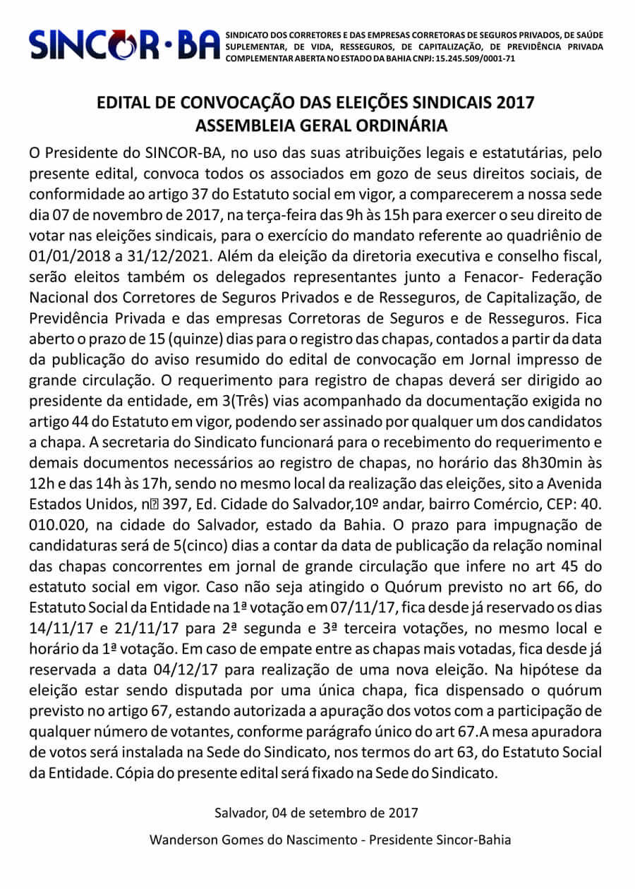 Sincor-BA : Edital de Convocação das Eleições sindicais 2017