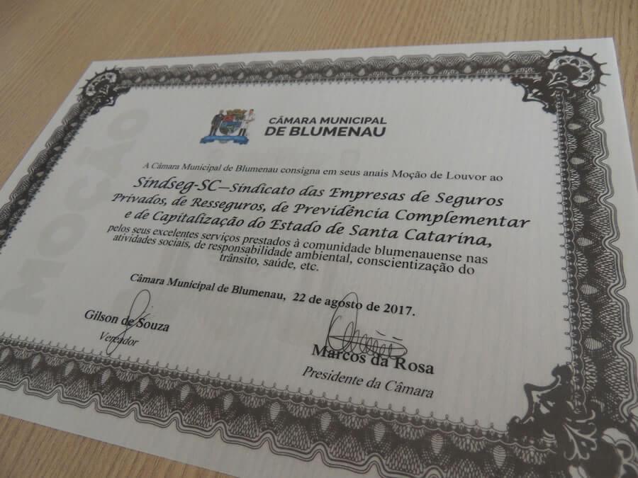 Sindicato das Seguradoras de Santa Catarina recebe Moção de Louvor da Câmara de Vereadores de Blumenau