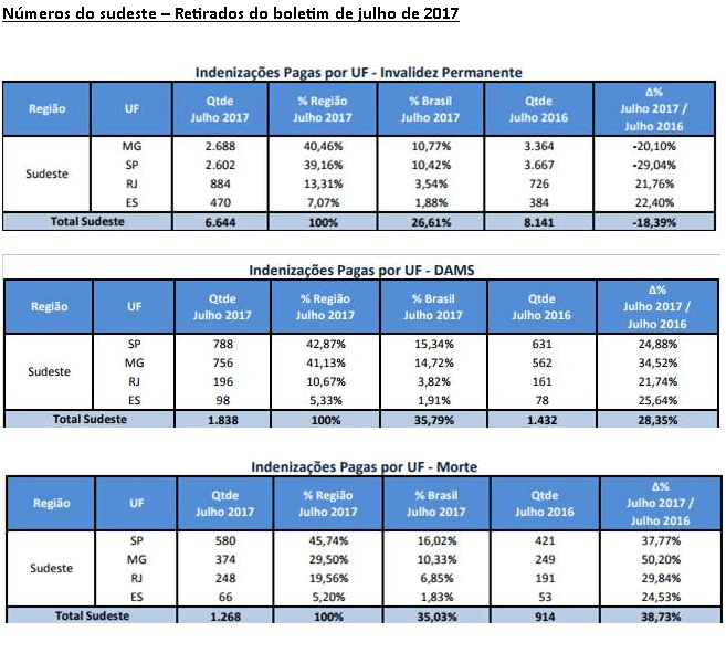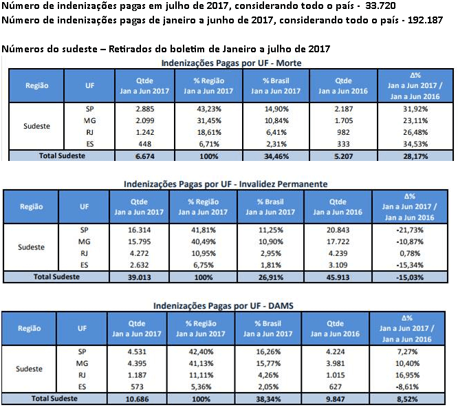 A pesquisa mostra, ainda, um aumento de 42% de indenizações por morte ante ao mesmo período de 2016. Foram 4.595 indenizações pagas a beneficiários de vítimas fatais em agosto.