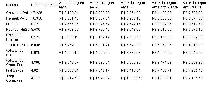 O levantamento foi realizado pela Bidu e analisa o valor do seguro dos dez modelos mais emplacados no último mês. Para a cotação, foi utilizado o perfil de um homem, de 35 anos, casado, sem filhos, com garagem em casa e no trabalho e que está contratando seguro pela primeira vez. As cotações foram realizadas em cinco capitais brasileiras.
