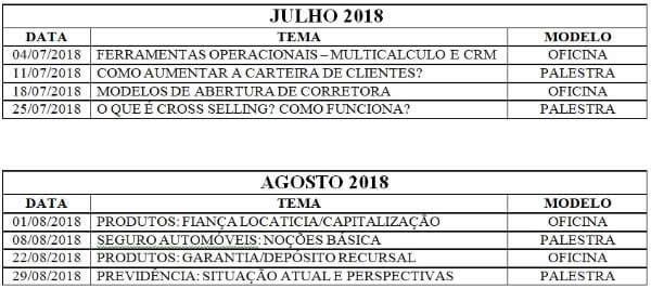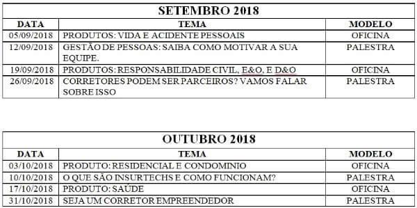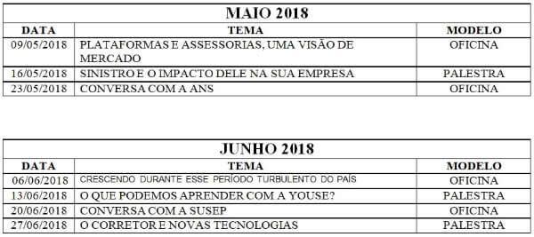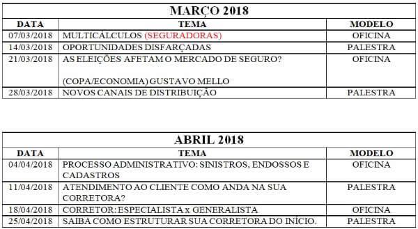 Os temas definidos de interesse aos corretores de seguros vão abordar todos os processos de como montar um plano de carreira promissor, parcerias entre corretoras e seguradoras, gestão de relacionamento, consultoria financeira e previdência privada, oportunidades disfarçadas, multicálculos, novos canais de distribuição, a gestão do sinistro e o impacto do mesmo na sua empresa, o corretor e as novas tecnologias, dentre outros assuntos.