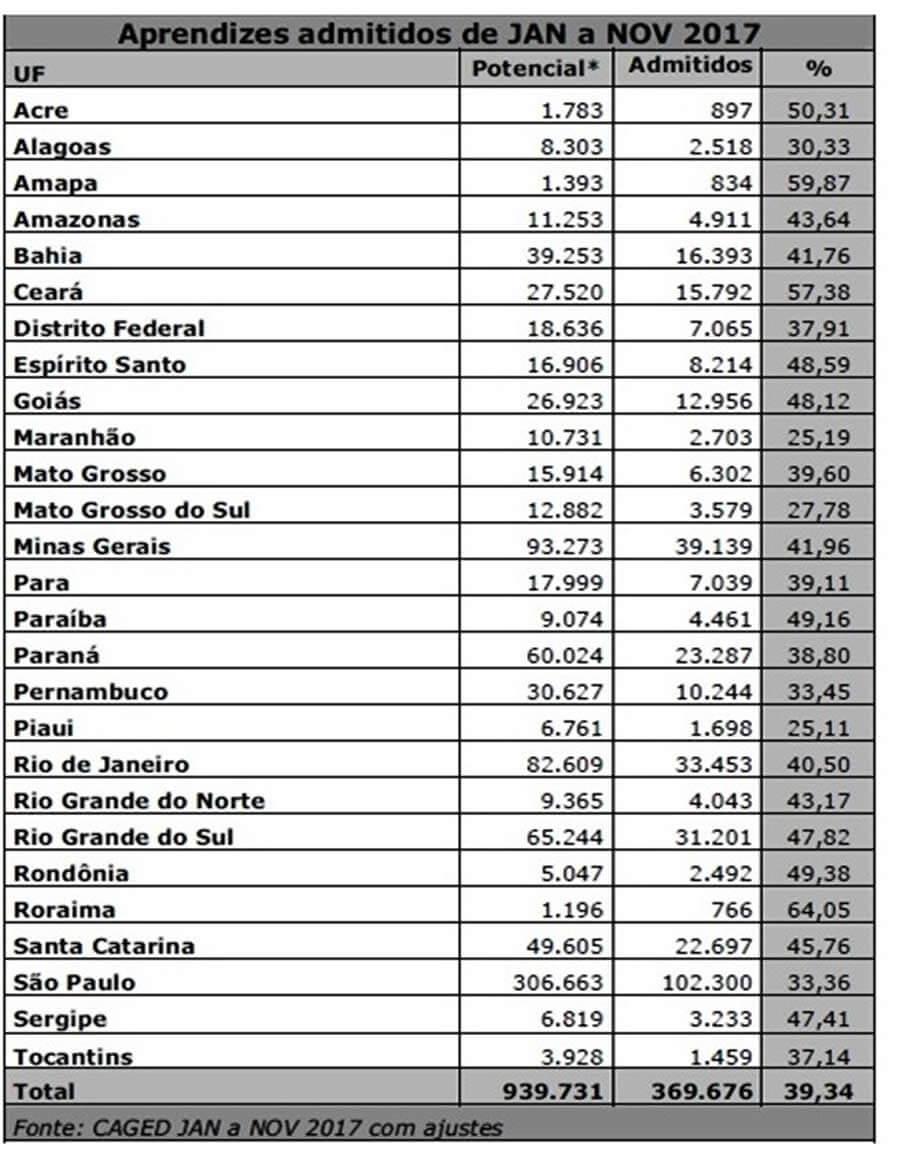 O mercado de trabalho do país contabilizou o ingresso de 369.676 mil jovens por meio da Aprendizagem Profissional, entre janeiro e novembro de 2017. De acordo com o resumo preliminar do Ministério do Trabalho, o estado que mais contratou foi São Paulo, com 102.300 mil admitidos, seguido de Minas Gerais, com 39.139, e Rio de Janeiro, com 33.453. No total, o Brasil já registra a contratação de mais de 3,2 milhões de aprendizes desde 2005, quando a lei que prevê essa modalidade de contratação entrou em vigor.