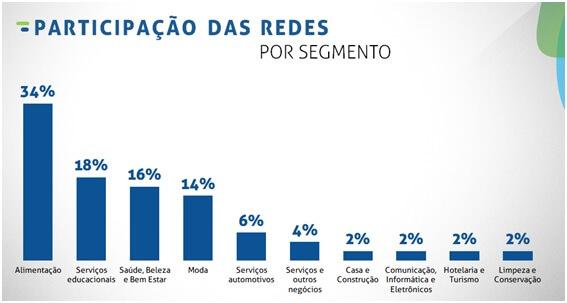 Em termos de segmento de atuação, o perfil das 50 Maiores é semelhante ao da edição anterior do estudo, com predominância de Alimentação (34%) e Serviços Educacionais (18%), mas, em 2017, houve o crescimento da participação do segmento de Saúde, Beleza e Bem-Estar (de 12% para 16%). “Este segmento vem apresentando desempenhos consistentes nos últimos trimestres e se mostrou aqui presente também, tanto com a manutenção da liderança do Boticário, quanto pelo ingresso de duas novas redes deste segmento no grupo das maiores”, explica o presidente da ABF.
