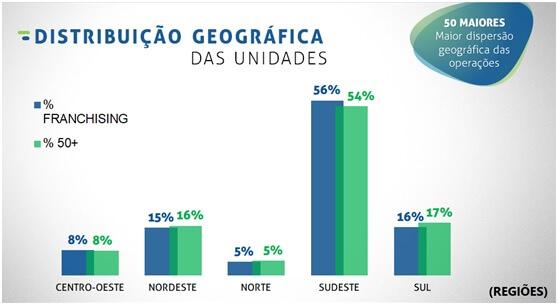Outro movimento detectado pelo estudo deste ano foi o crescimento de participação de pontos de venda alternativos (quiosques, trucks, contêineres, store in store, home-based, etc.) que passou de 6% para 9% - as lojas físicas predominam com 91%. A expansão de redes com grande atuação home-based, como a Acqio e a Seguralta, e quiosques, como a Piticas, também indicam este movimento. As 50 Maiores mostraram maior distribuição geográfica em relação ao mercado de franquias.