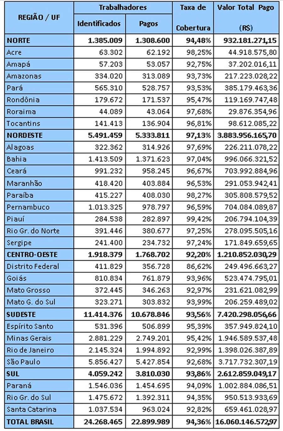 O Nordeste foi a região com maior taxa de cobertura. O percentual de trabalhadores com direito ao Abono Salarial que sacaram o beneficio chegou a 97,13%. No Piauí, por exemplo, a taxa de cobertura foi de 99,42%, a melhor do país. A região com menor desempenho foi o Centro-Oeste, onde 92,20% do total de beneficiários sacaram o dinheiro. O Distrito Federal teve o menor percentual, 86,62%.