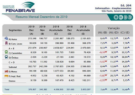 Nesta quinta-feira, 2 de janeiro de 2020, a entidade divulgou o desempenho do acumulado do ano de 2019, bem como o resultado do mês de dezembro, quando foram emplacados 370.957 veículos, 7,4% acima das 345.382 unidades, registradas em novembro.