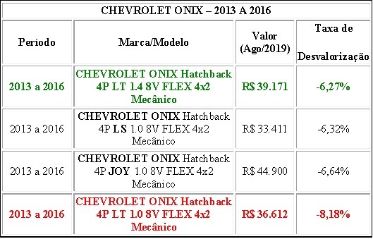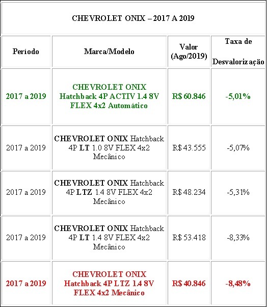 Nota-se que o Chevrolet Onix Activ 1.4 8v flex automático apresenta a menor taxa da análise com 5,1%, enquanto o modelo LT 1.4 8V flex mecânico da primeira geração perde 6,27%. O inverso acontece com os veículos mais desvalorizados, uma vez que o Chevrolet Onix LT 1.0 8V flex mecânico, do primeiro momento no Brasil, cai 8,18% em preço. Já o Onix LTZ 1.4 8V flex mecânico perde 8,48% em preço no período.