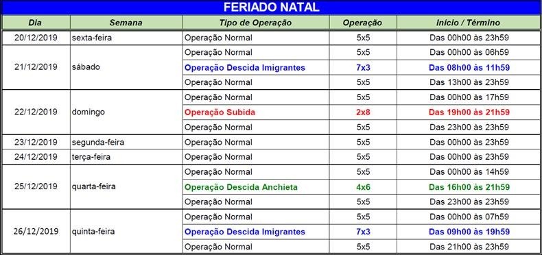 Para atender o volume de usuários que já vai iniciar a descida da Serra logo após o Natal, está prevista a implantação da Operação Descida (7x3) ao longo de toda a quinta-feira (26). A subida será feita somente pela pista norte da Imigrantes.