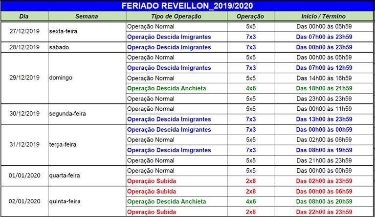 Para o retorno dos veículos, a Operação Subida (2x8) entrará em vigor já nas primeiras horas de 2020. A 2X8 ficará montada das 02h de quarta-feira (1º) às 07h da quinta-feira (02). Ainda na quinta, será implantada a Operação Descida Anchieta (4X6), entre 08h e 21h e no fim do dia, a Operação Subida poderá ser montada, das 22h às 23h59. Durante a Operação Subida, o usuário pode optar em subir a Serra tanto pela pista norte quanto pela pista sul da rodovia dos Imigrantes e também pela pista norte da via Anchieta. A descida será feita exclusivamente pela pista sul da Via Anchieta.
