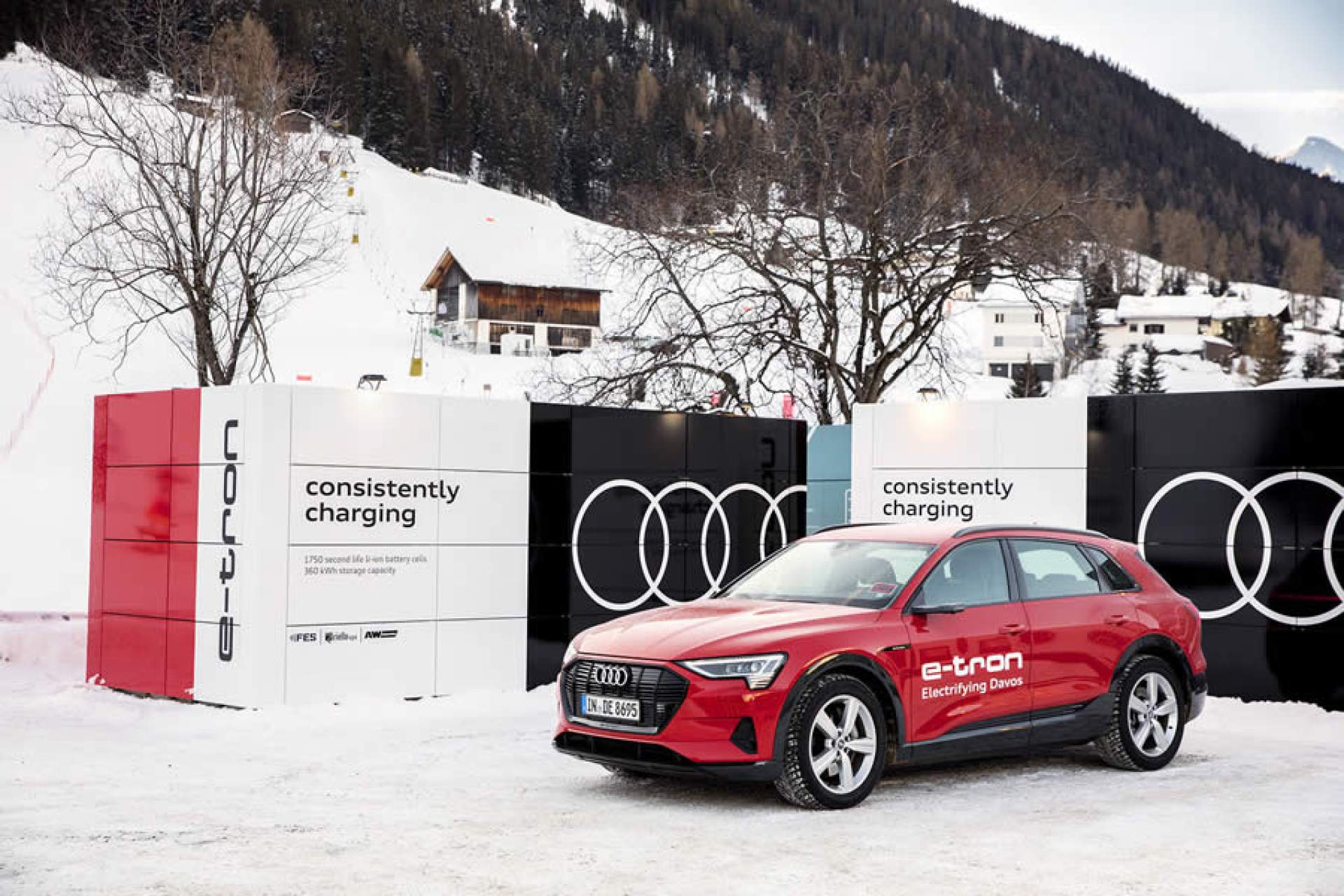Durante o evento, a empresa cria seu próprio ecossistema de mobilidade sustentável no inverno de Davos. Usar aproximadamente 100 modelos Audi eletrificados em combinação com os contêineres para recarga permite que a empresa acione uma frota de transporte neutra em emissão de carbono. Além do Audi e-tron, a frota conta com o Audi A8 como modelo plug-in híbrido. Os três contêineres são equipados com quatro sistemas de baterias usadas do Audi e-tron, que entregam uma capacidade total de carga de aproximadamente 700 kW em três terminais, cada um com saída de 150 kW, e capacidade de armazenamento de cerca de 1.0 MWh. Para isto, a Audi está cooperando com a empresa suíça de energia ABB. Esta solução reduz a carga sobre a rede local ao mínimo durante os horários de pico de demanda em particular. Por sua vez, a potência dos três contêineres móveis de carga em Davos é gerada por 100% da energia hidrelétrica local.