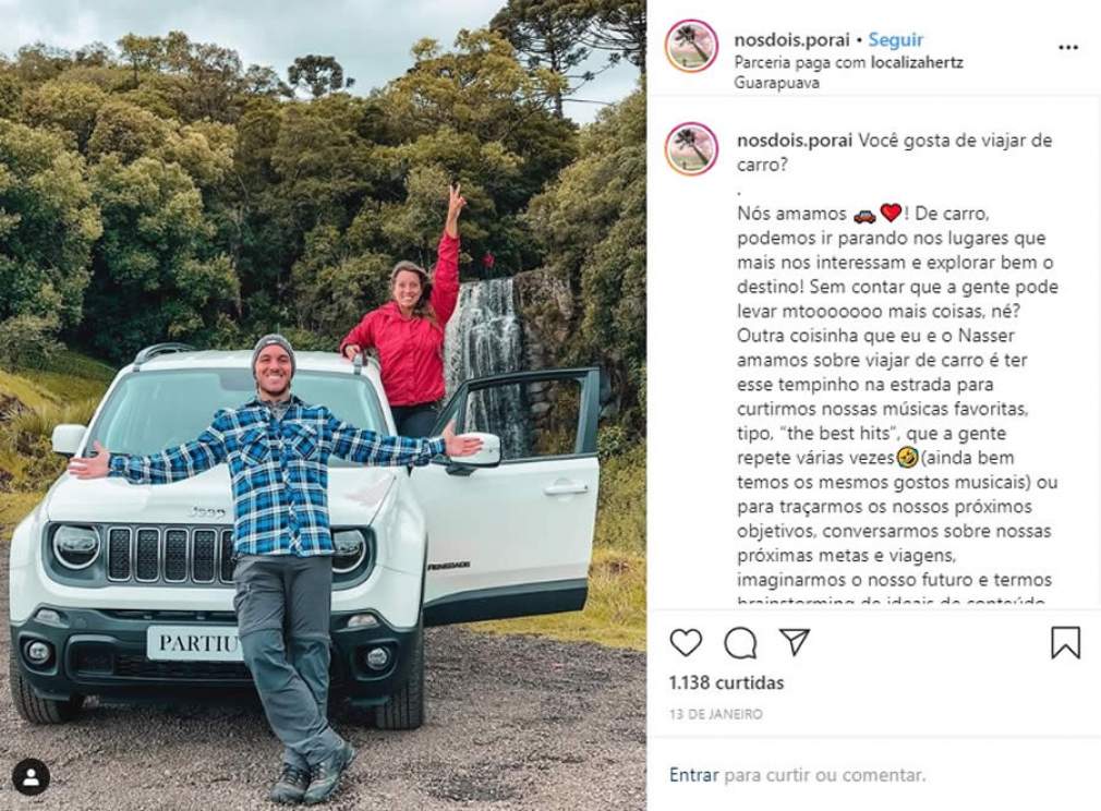 Hoje com 79 mil seguidores, o casal criou uma microempresa e firma parceria com diversas empresas quando estão viajando. O perfil se enquadra como microinfluenciador e já trabalhou em outras oportunidades com a Localiza nos últimos anos. Além da credibilidade de se aliar a uma líder de mercado, Nasser chama atenção para a sintonia entre o tema do seu perfil e o negócio da companhia. “Nosso segmento é de viagens e a maioria das nossas trips é feita de carro. Portanto, uma boa e verdadeira dica para o nosso público, feita por meio de uma publicidade contextualizada e sutil”, destaca.