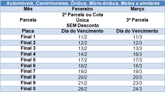 Hoje (26) é a última oportunidade para os proprietários de veículos com placa final 0 efetuarem o pagamento à vista, sem desconto, do IPVA 2020 sem a incidência de juros e multa. Por conta do feriado de Carnaval, o sistema atualizou o vencimento original, 24/2, para o próximo dia útil, 26/2. Quem optou por recolher o imposto em três vezes, também deve ficar atento e recolher a segunda cota até esta quarta-feira. O calendário de vencimentos se encerra na quarta e retorna em 11 de março apenas para os motoristas que irão pagar a terceira parcela do imposto.