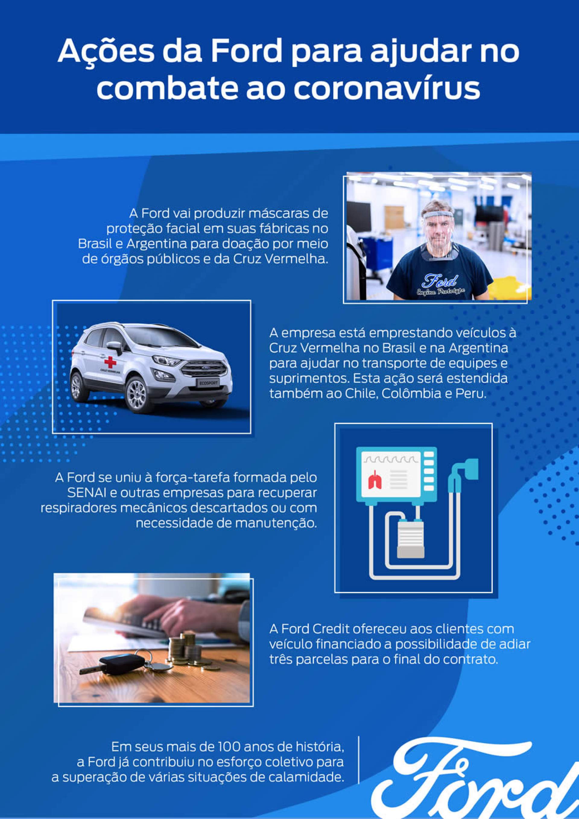 - Estas iniciativas se unem a outras importantes ações previamente anunciadas, como a recuperação de respiradores mecânicos e o adiamento de parcelas de financiamentos feitos pela Ford Credit.