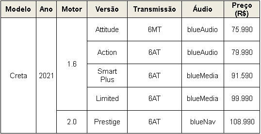 Saiba os preços da linha Creta: