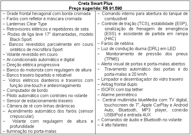 Confira abaixo a descrição completa do Creta Smart Plus: