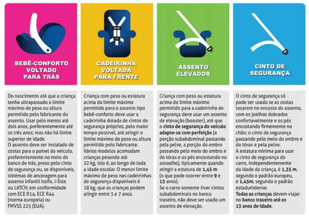 O conteúdo disponibilizado pela SBP (bit.ly/sbpdocent-ocup) detalha que, segundo as recomendações atuais das melhores práticas apoiadas em evidências científicas para o transporte de crianças em automóveis, o consenso é que as limitações se baseiem no tamanho da criança – primordialmente a estatura, mas também o peso – e na capacidade do dispositivo em acomodá-la, e não na idade.