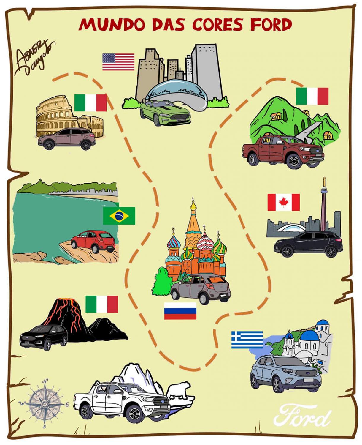 O novo teste da série Desafios Ford convida você a identificar os nomes das nove cores de carros da marca que são representadas nos desenhos. As bandeiras, assim como as construções e marcos geográficos, são pistas que vão ajudar a encontrar a resposta.