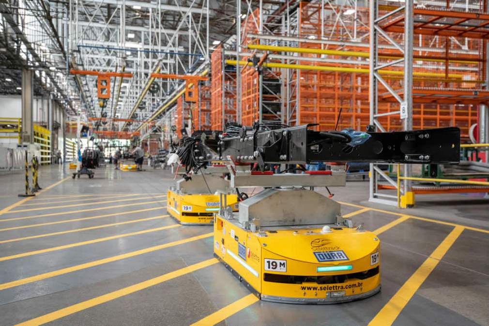 Para alcançar um máximo de flexibilidade e eficiência, a Dürr instalou um sistema de transporte único, composto por 51 pares de AGVs. O acoplamento dos AGVs trouxe garantia de flexibilidade na linha de montagem, atendendo à demanda do cliente em produzir todos os modelos de chassis de ônibus em uma única linha, desde os chassis micro-ônibus até os de ônibus articulado, com grande variação de peso e comprimento. Um ou dois pares de AGV’s, conectados via Wi-Fi, são capazes de operar em sincronização, podendo movimentar o enorme chassi do ônibus com até 20 metros de comprimento.