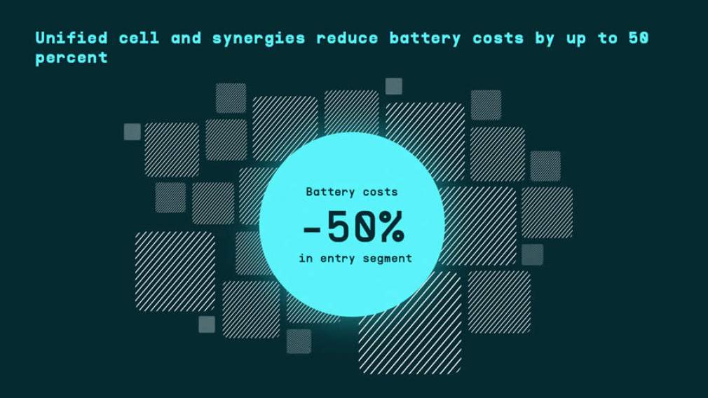 A Volkswagen está se esforçando para obter avanços significativos no sistema de baterias, incluindo todos os seus componentes, diretamente até a célula básica. "Queremos reduzir o custo e a complexidade da bateria e, ao mesmo tempo, aumentar sua autonomia e performance", explica Thomas Schmall, membro do Conselho do Grupo Volkswagen Group encarregado da Tecnologia. "No final, isso fará da mobilidade elétrica uma tecnologia de propulsão acessível e dominante." À parte da planejada produção própria, importantes benefícios nos custos são esperados inicialmente graças à nova célula unificada. Ela está programada para lançamento até 2023 e será instalada nas várias marcas do Grupo em até 80% de seus veículos elétricos em 2030. Outras economias serão obtidas pela otimização do tipo da célula e a adoção de métodos de produção inovadores, assim como uma reciclagem consistente. A Volkswagen quer assim reduzir gradualmente os custos das baterias no segmento de entrada em até 50% e no segmento de alto volume em até 30%.