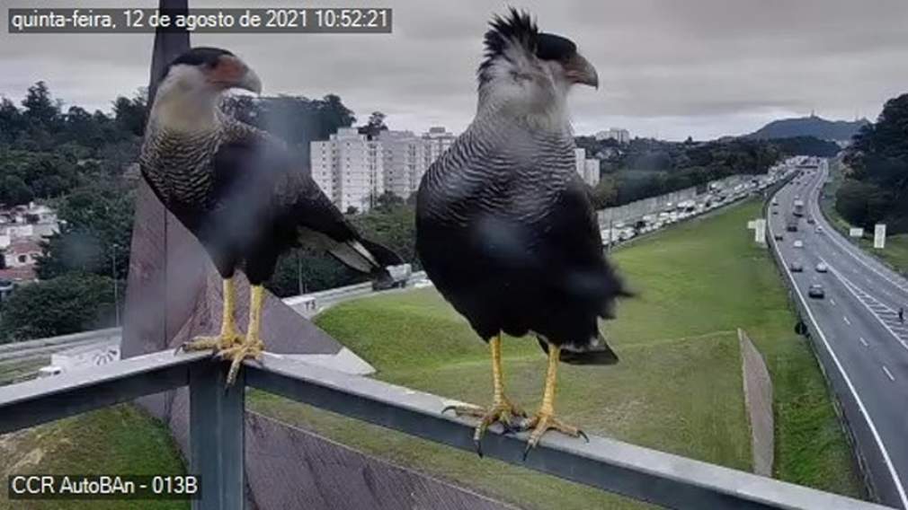Dois gaviões-carcará (Caracara Plancus) - provavelmente um casal - pousaram em frente à câmera de monitoramento de tráfego da CCR AutoBAn, localizada no km 13 da Rodovia dos Bandeirantes (SP-348), próximo à Marginal Tietê, em São Paulo, no final da manhã desta quinta-feira, 12 de agosto. O flagrante aconteceu por volta de 10h50.