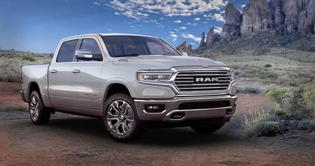 A caminhonete está disponível nas configurações Limited Crew Cab, com opção de motor HEMI V8 de 5,7 litros ou EcoDiesel (V6 3.6) e exibe grade com a logomarca RAM vermelha, mesma cor usada nos emblemas laterais e na logo que enfeita o apoia-braços central, na cabine.