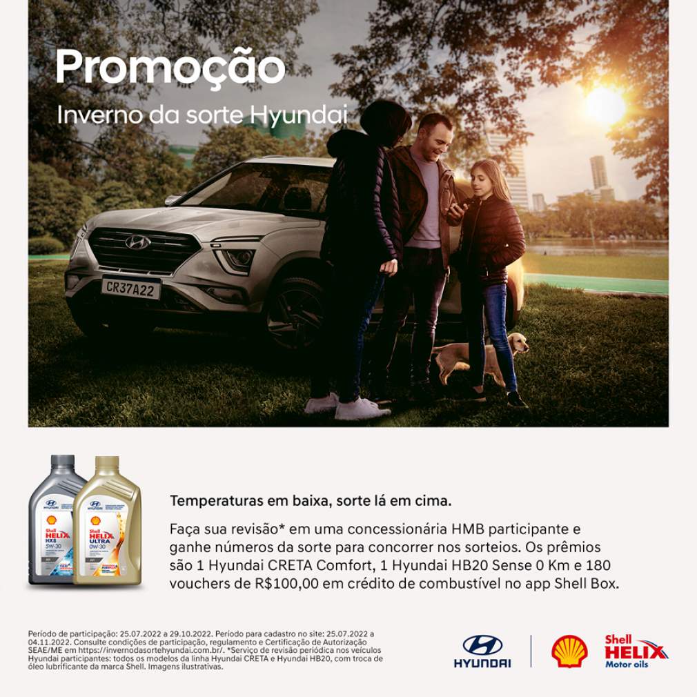 A Hyundai Motor Brasil repete em 2022 a parceria com a Shell Lubrificantes e apresenta a segunda edição da promoção “Inverno da Sorte”, que desta vez irá sortear um Novo Hyundai HB20 Sense, que acaba de chegar com visual mais moderno e conteúdo de segurança atualizado, e um Creta Comfort, ambos zero-quilômertro, para os clientes que realizarem revisões periódicas, com troca de óleo Shell, nas concessionárias participantes em todo o País. A ação promocional é válida de 25 de julho a 29 de outubro e o sorteio dos veículos será feito pela Loteria Federal em 9 de novembro.
