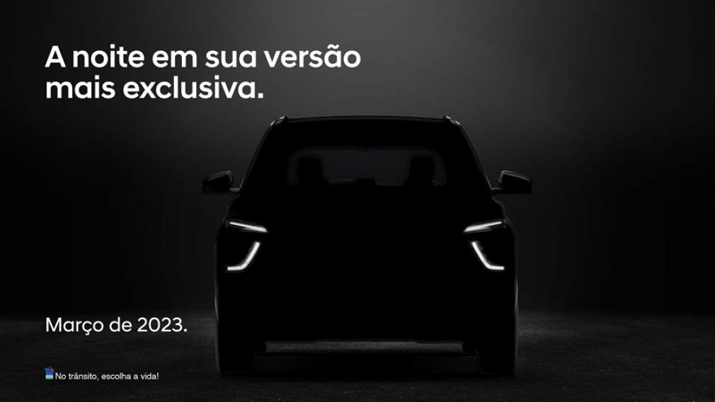A Hyundai compartilhou hoje, em suas redes sociais, um teaser sobre o Hyundai CRETA, SUV mais vendido do Brasil em 2023, indicando novidades para o modelo. Nas imagens, é possível ver apenas a silhueta característica do SUV da marca. A postagem traz a legenda “A noite em sua versão mais exclusiva”, sugerindo o que podem ser características do veículo, e reforça o mês de março como o definido para a chegada da novidade.